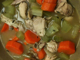 - Add the chicken stock, water, and thyme sprigs. Cook until the soup begins to boil.