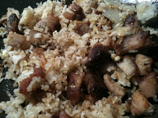 I’m still trying to get rid of the Thanksgiving leftovers, without throwing any of it away. Here’s a quick recipe I whipped up today with the leftover roast pork and rice.