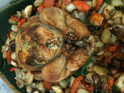 Roast Chicken and vegetables (carrots, parsnip, and potatoes) |