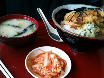 | Tempura Don – shrimp and vegetable tempura served in a bowl over rice w/ Japanese pickles and miso soup |