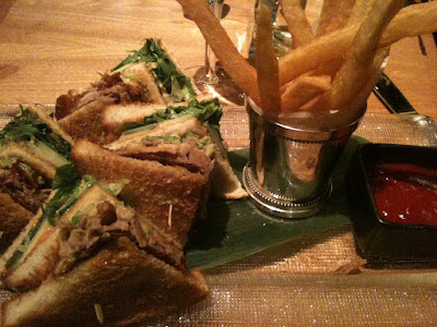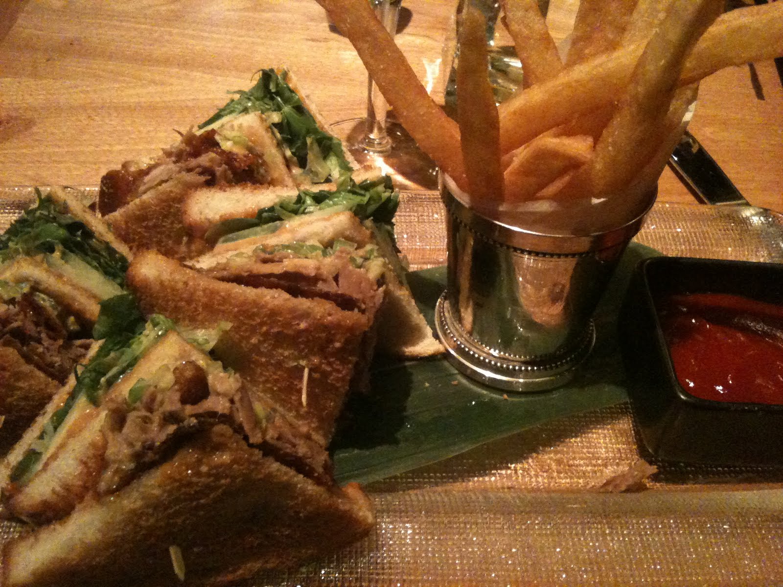 ‘Lean’ Peking Duck breast, skin-on in a double decker sandwich served on toasted white bread. My first bite had me thinking of a bahn mi (Vietnamese sandwich) because of the hoisin mayo, cucumber slices and cilantro. The skin was lightly crisp and didn’t have much fat underneath it. Overall I was very impressed with the quality of the meat: tender, flavorful, and succulent. I highly recommend this dish. I didn’t feel guilty eating the sandwich – skin and all. The last time I ate the skin of Peking Duck was when i had dinner at Buddakan. I won’t share their cooking method. A little secret of mine.