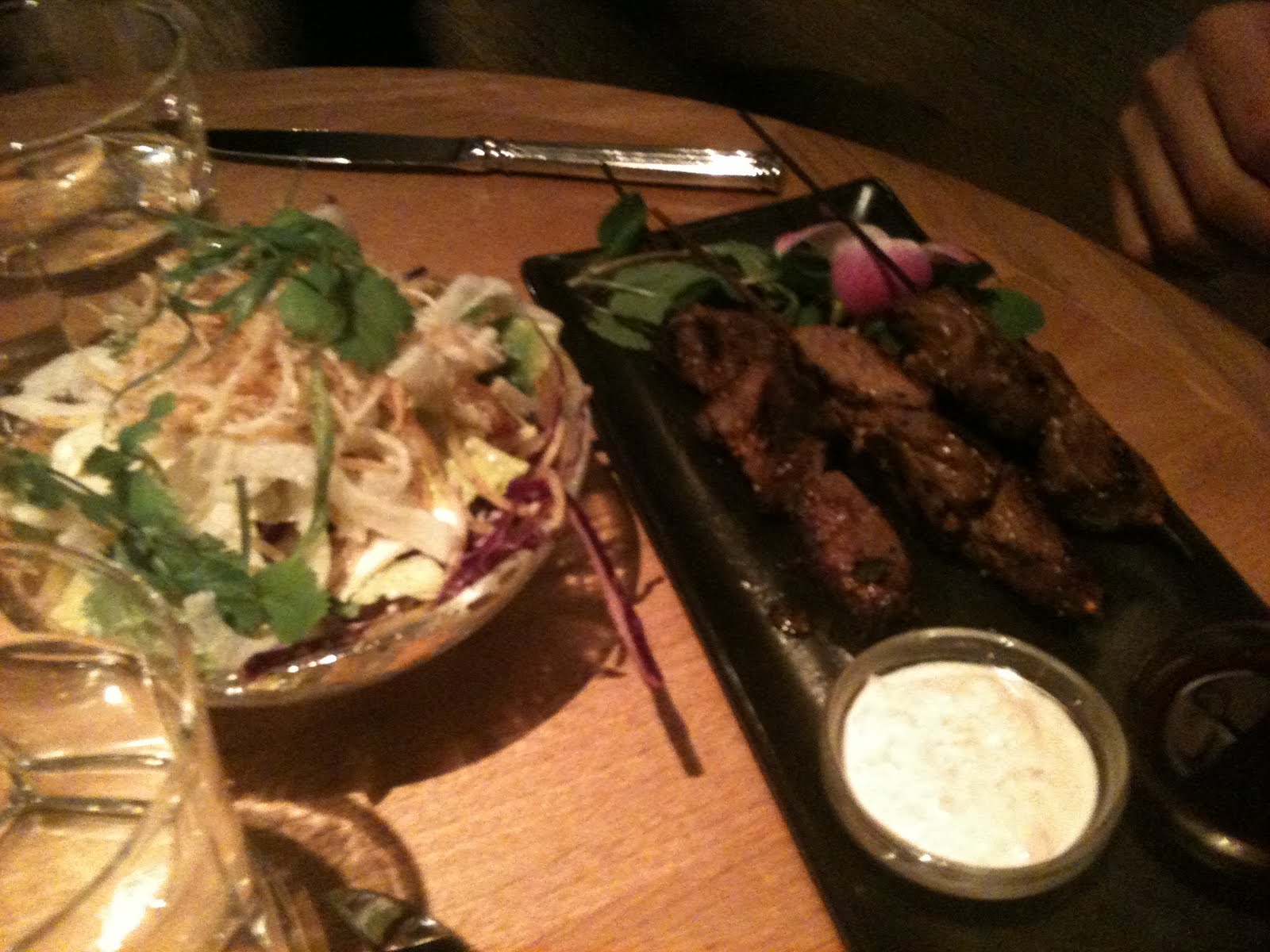 Tender chunks of steak served on skewers with two dipping sauces: horseradish and ponzu. The jungle salad is a perfect name for it: lettuce, shredded cabbage, bits of fried shrimp chips and a light dressing. Looked like a jungle, but delicious.