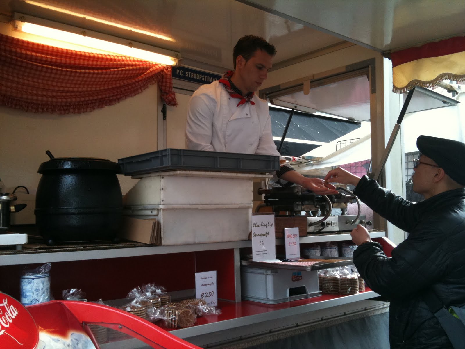 Stroopwafels (English translation: syrup waffle) are waffles made from two thin layers of batter glued together with a caramel-like syrup. You can get a King Size stroopwafel made to order for 1,50€ or a Chocolate King Size stroopwafel for 2€.