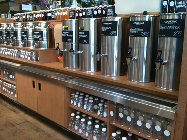 - A filling station for vinegar, honey, agave, and liquid aminos (shown below). This is very convenient if you only need 1/2 cup of an ingredient – just grab an empty bottle and fill it up with as much as you need and pay by the pound.