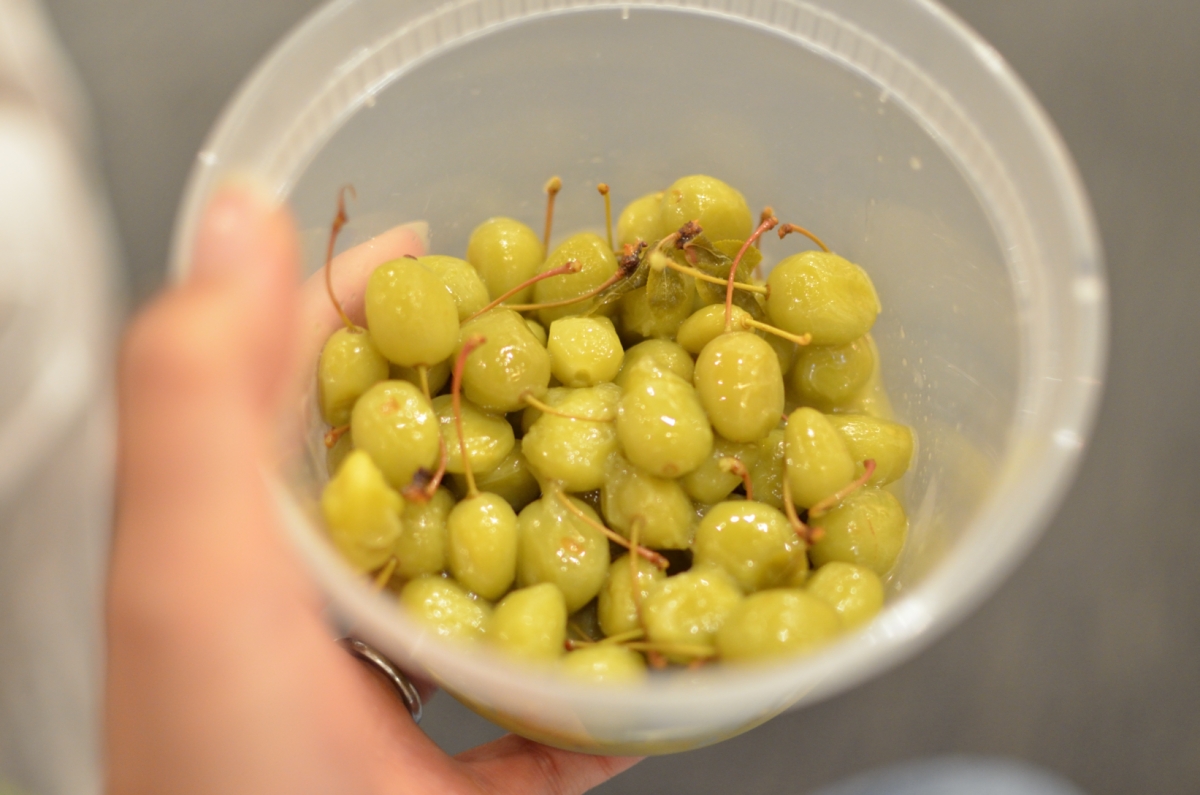 | Pickled almonds topped with mackerel, pickled mirabella, roasted almond oil, and ground fennel |