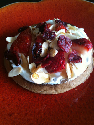 - Sprinkle the strawberries, almonds, and cranberries or goji berries