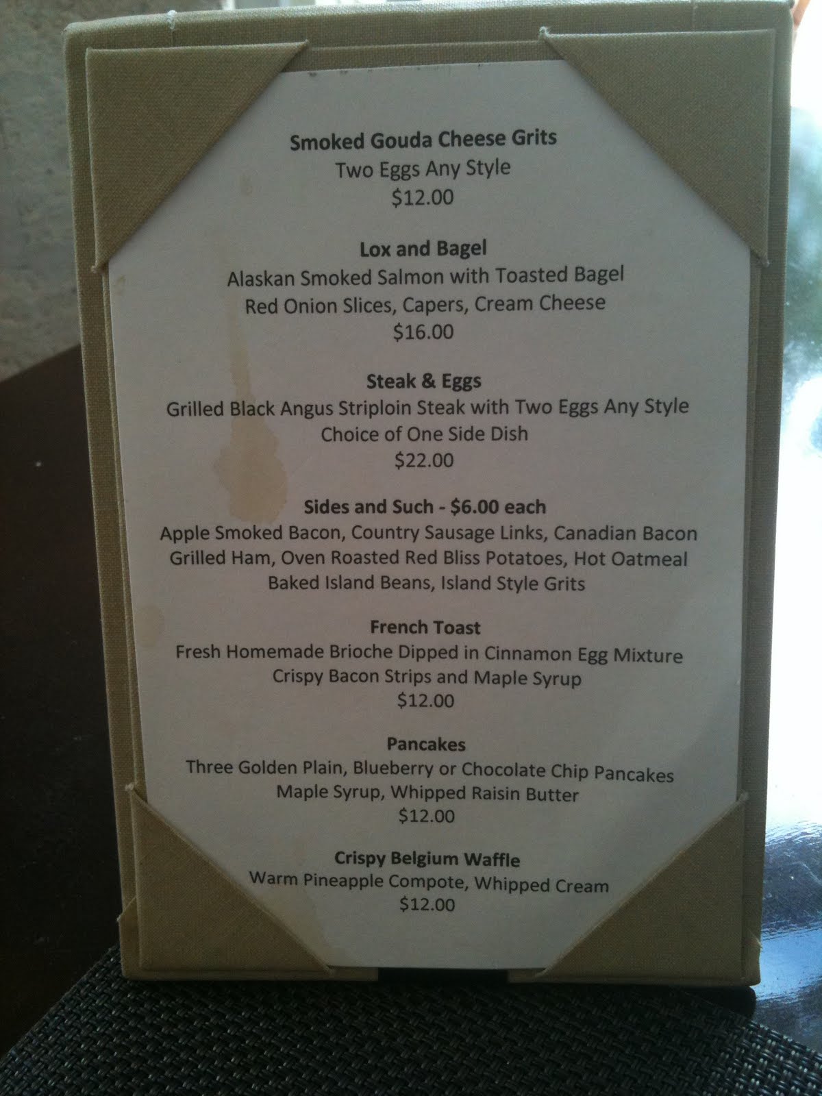 You can also order hot breakfast items, like omelets, pancakes, and Belgian waffles, priced $12 and up: