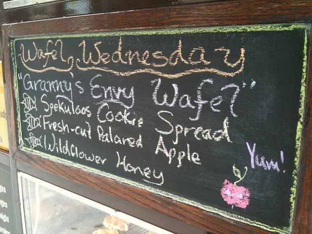 Instead of getting my favorite combination – Nutella and Bananas, my wafel maker convinced me to get the daily special: Granny’s Envy Wafel, $7, made with Spéculoos Cookie Spread, Fresh-cut Palared Apple, and topped with Wildflower Honey. A divine combination. What got me to order this? The spéculoos – which I first tried in a Belgian cheesecake prepared by Les Tartes de Francoise, a Belgian bakery in Hell’s Kitchen.
