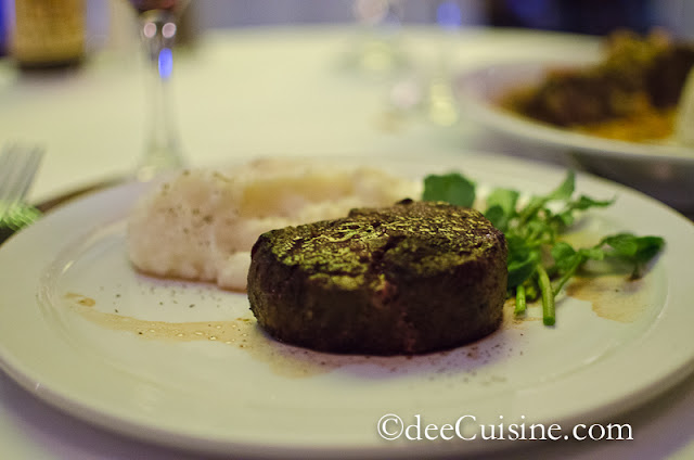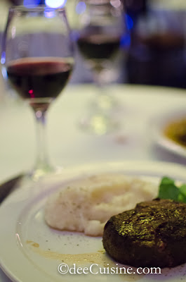 For the main course, we had the Petite Filet Mignon with garlic mashed potatoes. Though we asked for the steak to be cooked medium, it was served medium well, but it was still delicious. There was no need for steak sauce as the meat was flavorful. The mashed potatoes were perfect with a light garlic taste, and not too buttery. We paired this dish with a glass of Edna Valley Vineyard Pinot Noir.