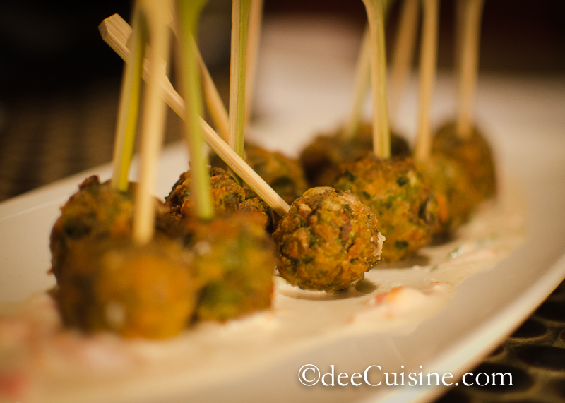 - Edamame Falafel made with raita and curry flavored couscous.
