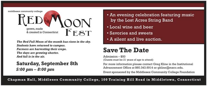 The Red Moon Fest will take place on Saturday, September 8th. This evening celebration with feature locally-produced foods, wines and beers, as this year’s theme is “Grown, Made, & Created in Connecticut.” The event will also feature music by the Lost Acres String Band.