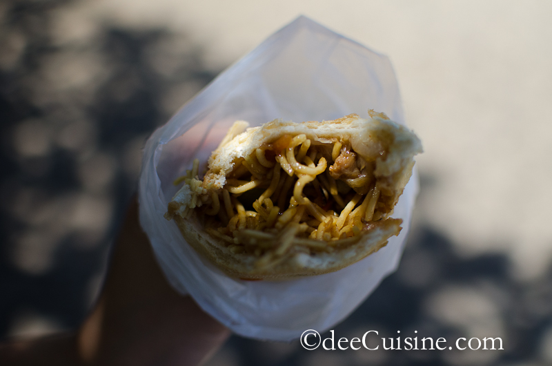 | An interesting sandwich that we had to try: Chao mein on a baguette. Price: 100 XPF (about $1.75) – not a bad snack if you’re hungry. |
