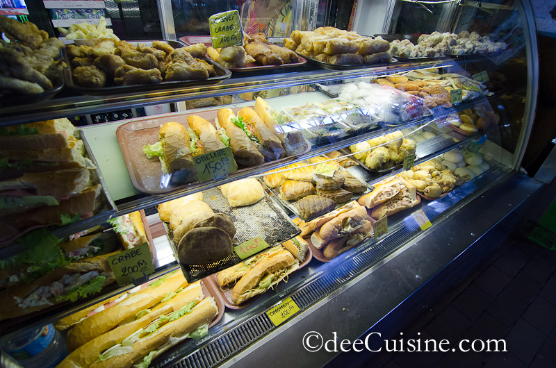 | A variety of sandwiches, egg rolls, shao pao and other snacks for sale, mostly under 250 XPF (or $2.70). |
