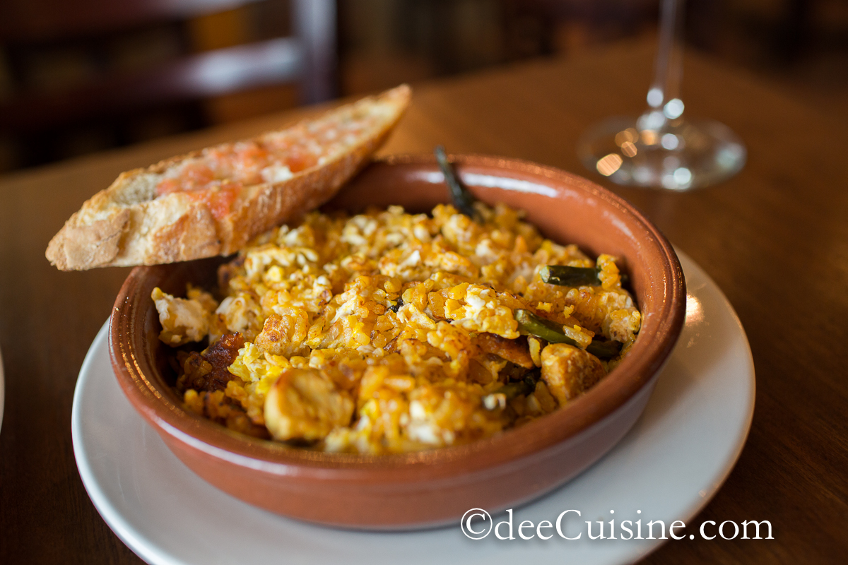 We tried several items on Sala’s brunch menu, starting with the Torrijas, a plate of French toast served with Pedro Ximenez syrup and an apple compote. The French toast is crispy on the outside, and creamy inside. Drizzle some of the sweet Sherry syrup and you’ll be indulging (and Mmm-ing) in every savory bite. If you like paella, we highly recommend the Revuelto de Paella, a chicken paella made with scrambled eggs and served with a piece of pan tumaca).